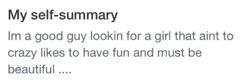 Your bio is your opportunity to sell yourself. Not like this, though. But we like that he has standards and would seemingly settle for a girl who is a little bit crazy, as long as she “likes to have fun”.
