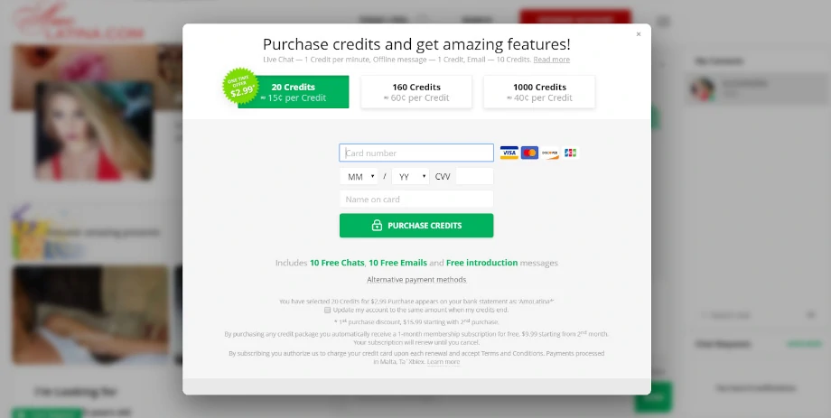 Why would a site send out automatic messages to new accounts like mine? What’s in it for them? The answer was immediately clear when I tried to send a message back to that first young woman. As soon as I started typing, I was automatically redirected to an account upgrade page. Yes, with AmoLatina, you have to pay to play.