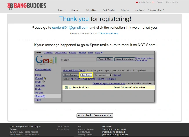 Another red flag that came up early while I was researching for this BangBuddies review was a strange request from the site. Right after I signed up, they took me to a page where it explained how to unblock their emails from my spam filter. In light of my experience with this site, here is a new rule: any site that makes you unblock them from your email spam filter is probably going to send you a lot of spam. It’s not a promising sign.