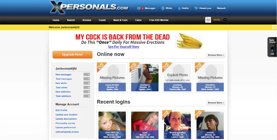 I found XPersonals to be particularly shady. Upon logging in, the page greeted me with a glaring advertisement for erectile dysfunction medication right in the header. There was also a big, gaudy yellow bar telling me to upgrade my membership and a bunch of menu options that were unrelated to any dating service. Everything about the layout and appearance was sketchy.